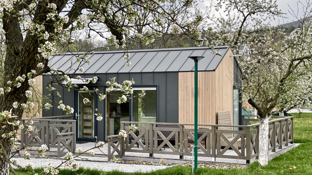 Zdobiony drewnem domek z tarasem, ze wspaniałym wnętrzem dostosowanym do Twoich potrzeb. Posiada klimatyzator, który zapewni komfort w upalne dni oraz ciepło zimą. Domek dzieli się na sypialnie, kuchnie połączoną z salonem oraz łazienkę. Kuchnia wyposażona jest w indukcje, czajnik, lodówkę. zaparzacz do kawy oraz podstawowe wyposażenie kuchenne t.j. noże, talerze, szklanki. W części salonowej znajduje się rozkładana sofa, dwa fotele, komoda, stolik oraz telewizor.